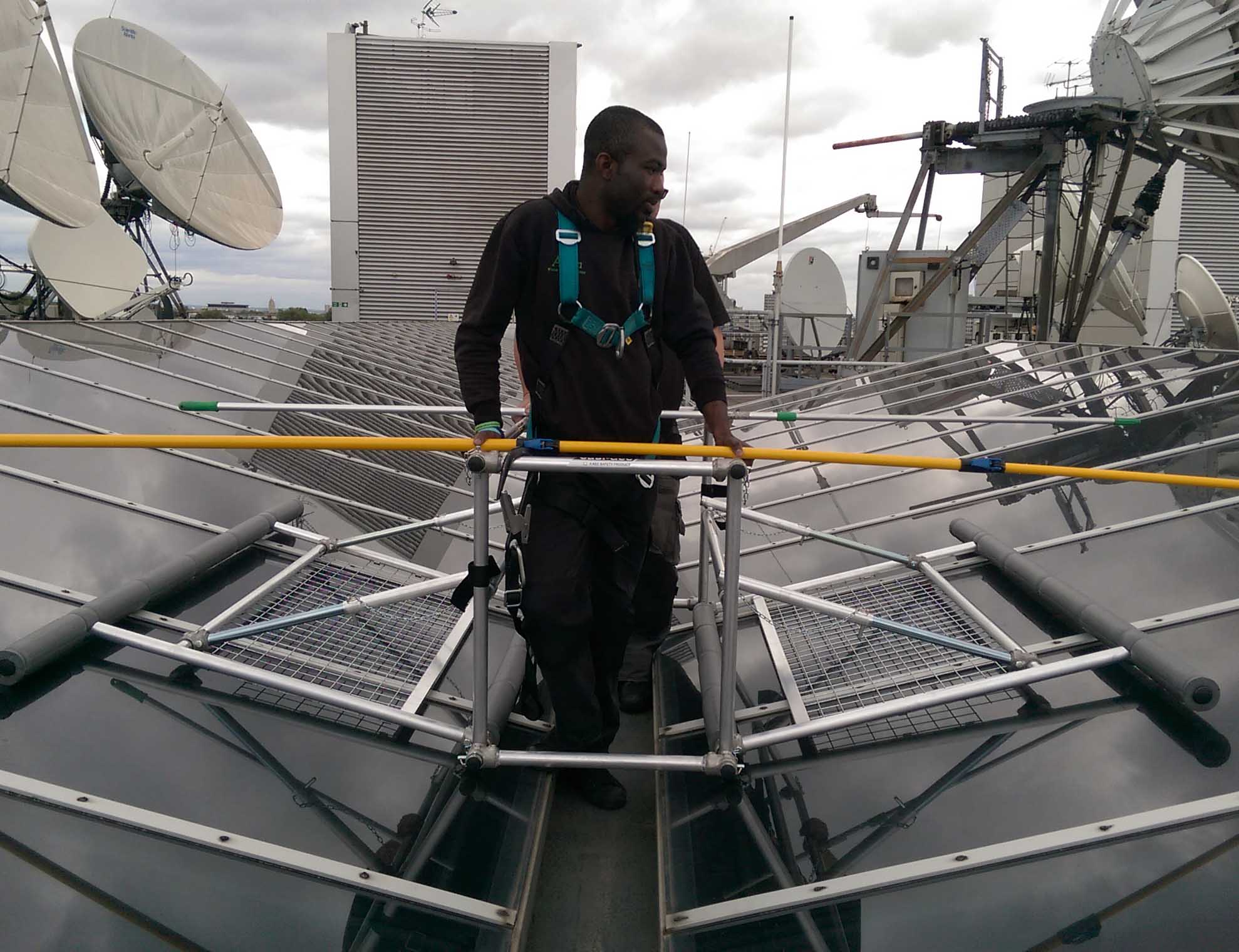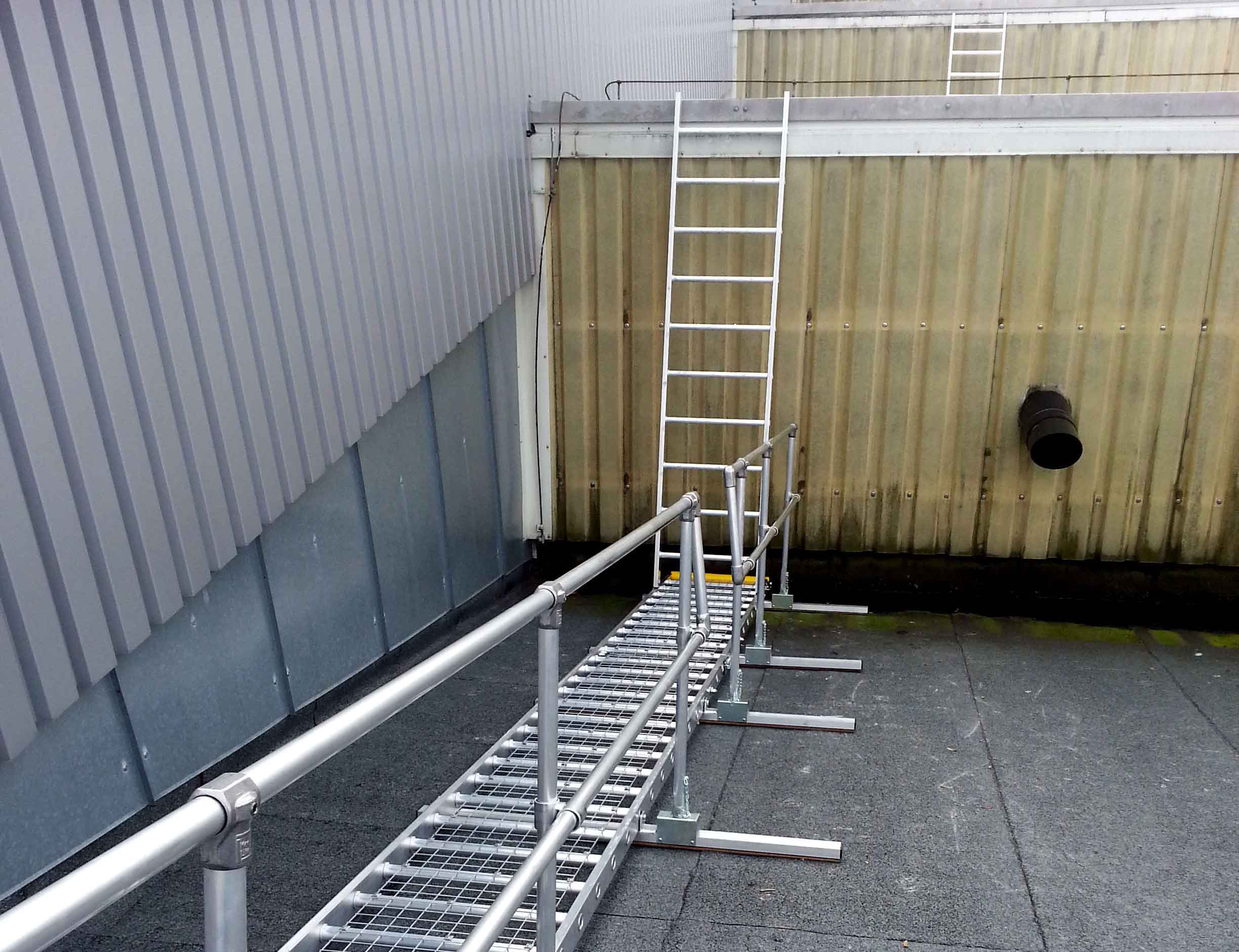 Roof-Walk 是全防護型滾動式工作平台,安裝在兩條軌道上,以便工作人員在屋頂上下移動。 平台標準長度為 4.6 米,通過兩條 4 米長的模組化連接軌道實現上下移動。軌道還配備安全格柵和支撐板條。